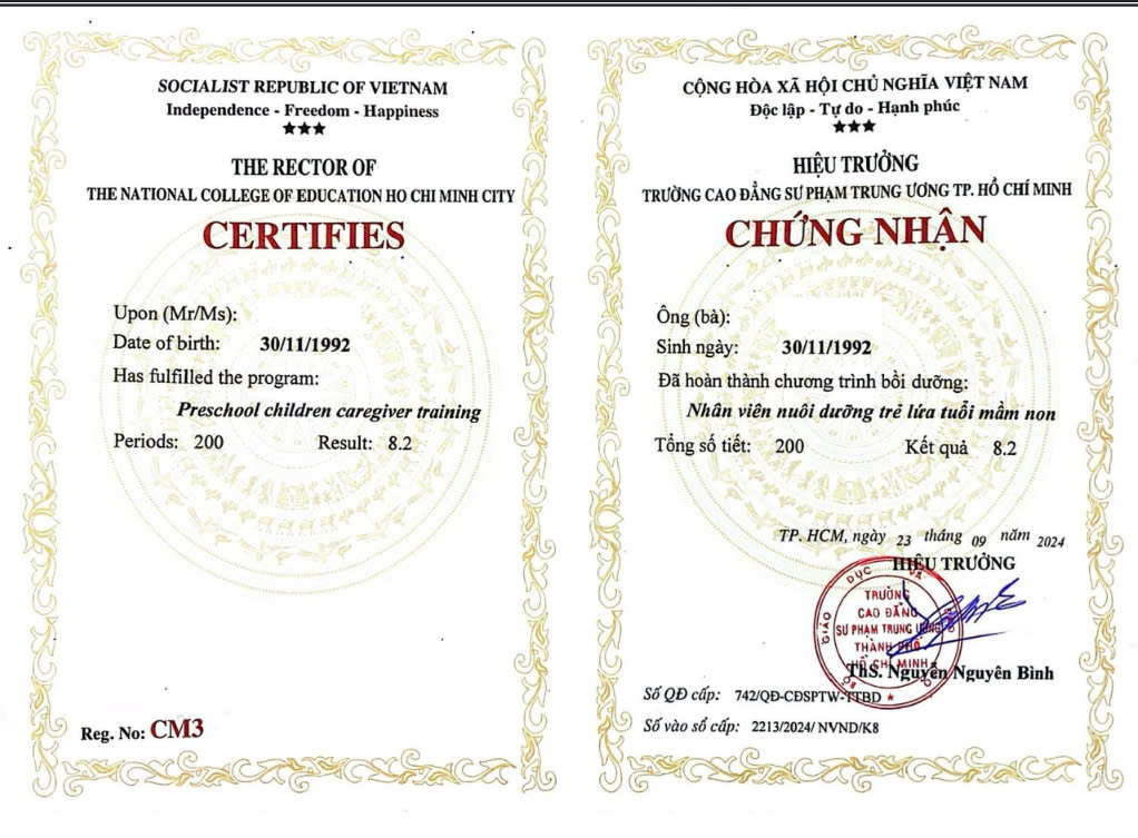 Kết thúc khóa học, học viện đạt yêu cầu được cấp chứng nhận của trường Cao đẳng Sư phạm Trung ương TP HCM cấp